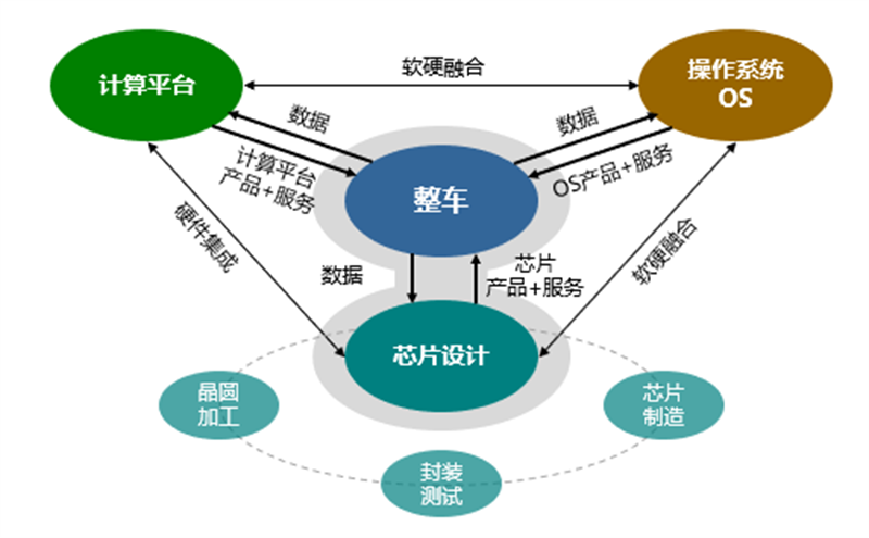 众所周知,对于“新汽车”而言,芯片及操作系统OS构成的小生态极其重要。实际上,芯片和OS本身既有关联,又是彼此相对独立的领域。像芯片设计、晶圆加工、芯片制造和测试等等,是一条非常复杂的产业链;而OS的开发也是一项高度复杂的系统工程。不过从整个汽车产业的角度看,它们只能被归类为一个小生态,必须接入中生态以及大生态并为两者提供支撑和服务。为此,芯片设计者、计算平台提供者、OS供应商之间必须充分打通,以确保软硬融合,实现性能优化;同时各自还必须与整车业务充分打通,从而形成各方参与者彼此依赖、交织互动、分工协同的深度合作关系。详见图4。