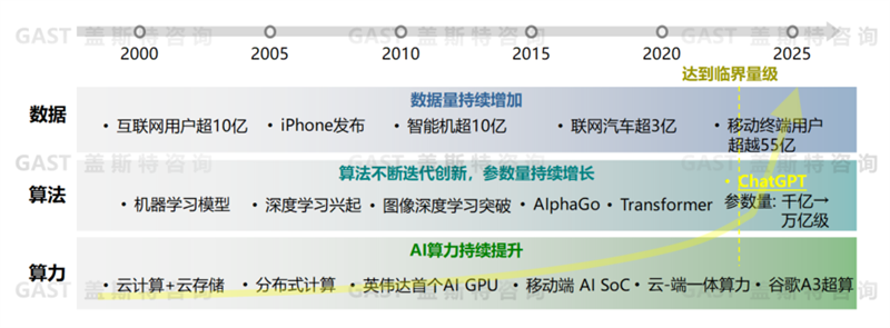 大模型是一种大规模预训练AI模型。AI模型从2000年发展至今,历经了机器学习、深度学习到预训练模型的三个发展阶段。当AI模型训练的数据量、算法参数量、算力三者持续提升并达到临界量级(如图1所示),AI模型的生产力由量变到质变,展现出智能推理和内容生成的能力,由此诞生了大模型。