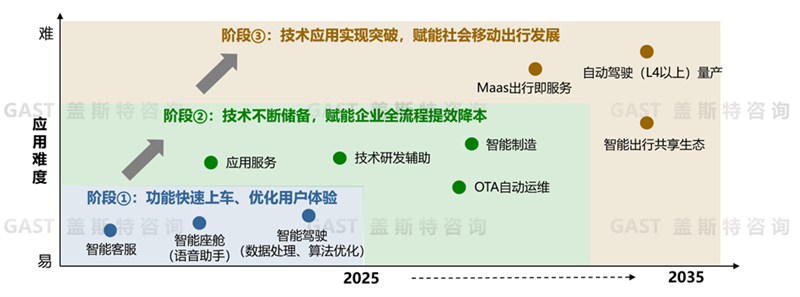 如图7所示,根据大模型赋能汽车各应用场景的渗透时间与应用难度,可将大模型应用划分为三个阶段: