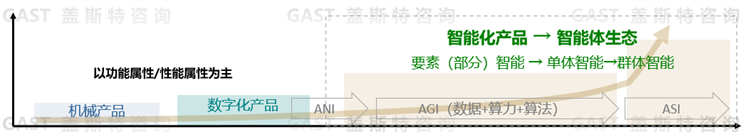由此可见,数字化能力是汽车发展的底层支撑,其从量变发展到质变,推动新汽车向智能体演进,其发展可归纳为ANI(狭义人工智能)、AGI(通用人工智能)、ASI(超级人工智能)共三个阶段。需要强调的是,数智汽车的落地必须依赖生态的支撑。生态支撑进化,进化又推动生态建设,最终将形成全新的智能体生态。