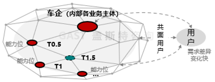 显然,传统的分工模式已无法满足数智汽车落地的需求,构建新型合作关系成为必然趋势。各主体需在专业化分工的基础上,通过协同创新来共同推动用户价值的创造和实现。因此,未来整车企业与供应商将形成能力协同型的生态关系,各主体具备的能力点代表背后的生态位,各主体充分共享、高效协同形成生态网。该生态网的核心特征为能力互补、高度开放、动态生长、强调融合,且更换代价大。而面向“能力型”生态圈的建设,车企既要与掌握不同能力(生产力/要素)的外部主体间有效协同,也要确保内部各业务链的主体充分共创。