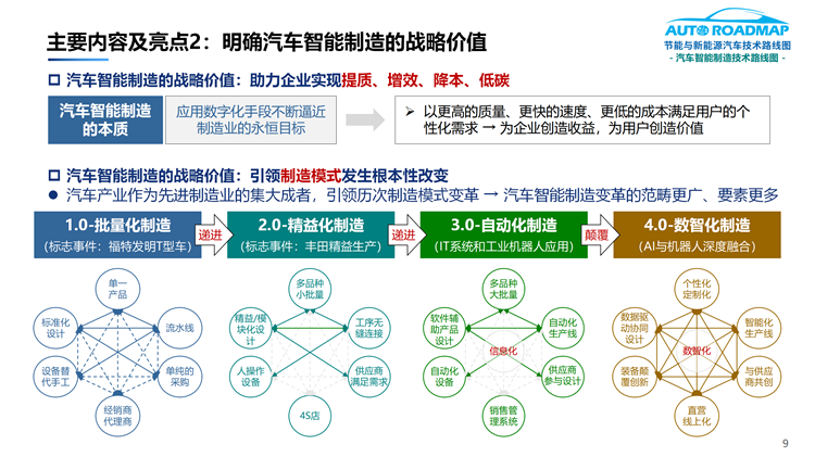 2.明确了汽车智能制造的战略价值,即助力企业实现提质、增效、降本、低碳