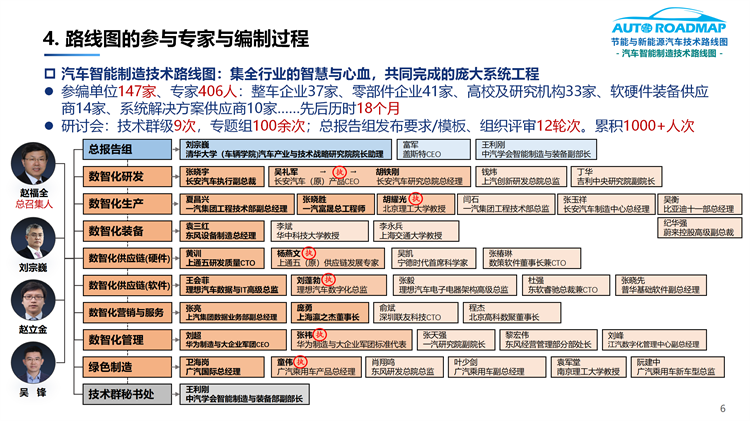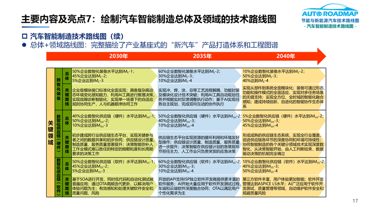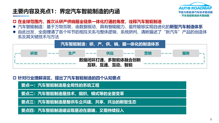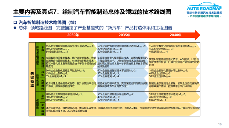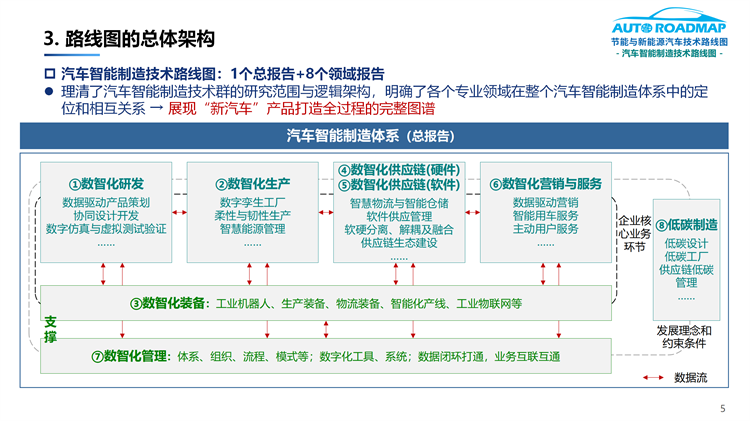 7.完整描绘了具有产业基座式的“新汽车”产品打造体系和工程图谱(即汽车智能制造总体及分领域的技术路线图)