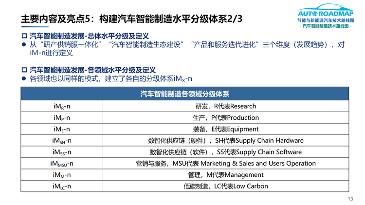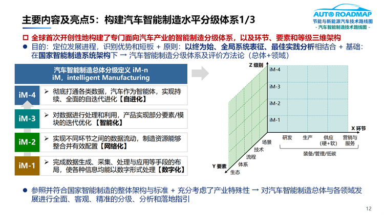 5.全球首次开创性地构建了专门面向汽车产业的智能制造分级体系(iM-n),以及环节、要素和等级三维架构
