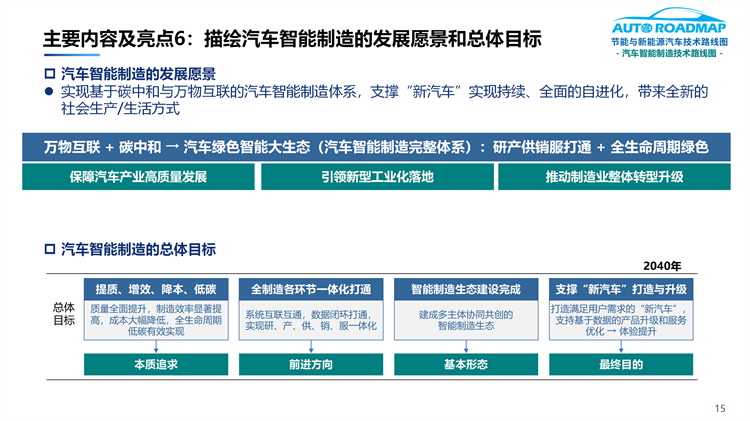 6.描绘了汽车智能制造的发展愿景总体目标: 实现基于碳中和与万物互联的汽车智能制造体系,支撑“新汽车”实现持续、全面的自进化,带来全新的社会生产/生活方式