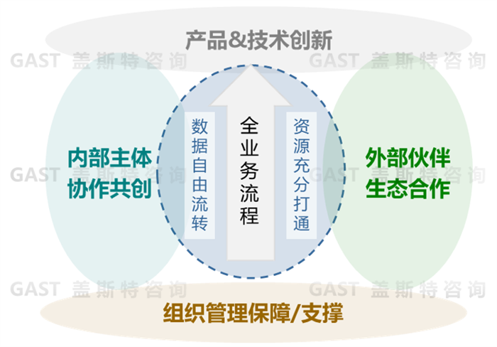 知识与技术的融合背后涉及不同主体的协同。企业实现创新的关键在于如何从自身需求出发,有效整合各方主体及其能力。这不仅是一个技术问题,更是一个生产关系问题,即企业内外部团队需要在全生命周期和全业务链上实现充分互动、要素畅通和资源共享。如图2所示,企业需要推动内部有效协同共创和外部生态化合作,以实现产品与技术创新的协同共创。内部主体协作共创是实现融合创新的前提。企业必须确保内部各业务主体之间的资源可以无缝流转,例如运维侧的数据需及时反馈至产品定义阶段,以赋能体验优化。这种内部协同要求数据自由流动和资源充分打通,从而打破内部壁垒,实现高效协作。外部伙伴生态合作则是融合创新的延伸。企业需要与外部伙伴建立伴生式合作关系,推动整供资源的充分拉通和跨阶段动态共享。例如,供应商的产品数据需持续跟踪至服务落地和维护更新阶段,从而实现能力的共同成长。