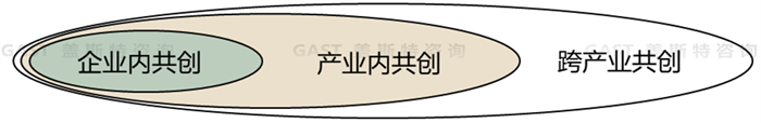 在车企具体实践过程中,围绕内外部的共创可大致分成三个层次,如图5所示:1、在企业内部实现共创,即内部单一部门(如研发)或跨部门(研发、生产、供应)基于已有技术进行再迭代和再创新;2、车企与产业链内合作伙伴(如芯片厂商)围绕新产品、新技术进行联合开发,实现深度协同;3、车企与其他产业主体(如ICT产业)围绕技术迁移应用和新技术的突破互通有无、联合创新,拓展创新的边界。