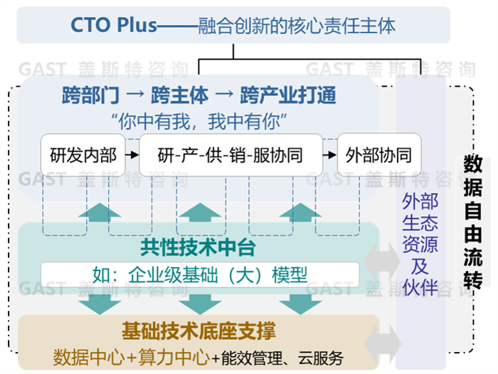 最终,为了能够实现内外多个主体的数据自由流转,支撑CTO Plus与各主体的研发决策与资源共享,车企还要构建融合创新的基础技术支撑,通过数据中心、算力中心、能效管理与云服务等底座的建设,支撑企业共性技术中台的搭建(如企业级的基础大模型),实现各主体的实时连接、知识共享与能力协同。