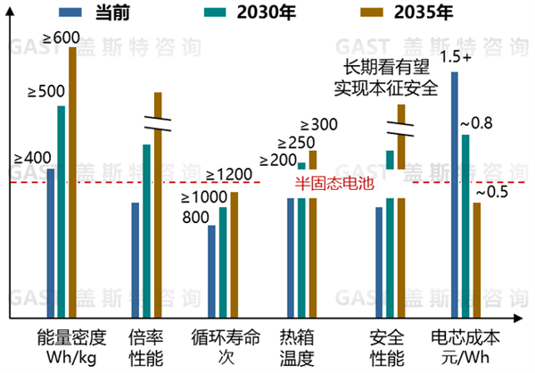 在能量密度上,当前已达到330~380Wh/kg,未来通过选用超高镍正极、高硅负极,在2030年、2035年分别达到450Wh/kg、500Wh/kg。