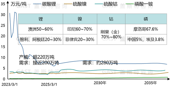 钴资源总体产能过剩,受刚果(金)出口限制政策影响,短期价格上涨,但中长期有下行压力。