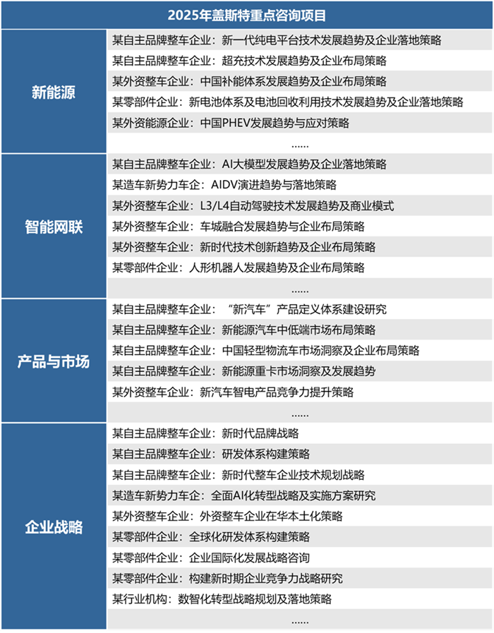 盖斯特在2025年取得的成果,源于洞察创造价值的初心和客户的信任。自2013年成立至今,盖斯特累计完成各类企业、地方政府及行业组织的重大战略研究及咨询项目750余项[lxh1] ,累计输出汽车产业与技术战略研究报告1800余份。今后我们将持续深化研究,以前瞻的趋势判断、精准的解决方案、深度的落地支持,陪伴客户穿越产业变革周期。无论您面临战略转型、组织变革和管理提升,还是技术路线选择、产品规划、全球化布局等挑战,盖斯特都愿意成为您最可靠的战略伙伴,携手共创“新汽车”时代的新增长空间。