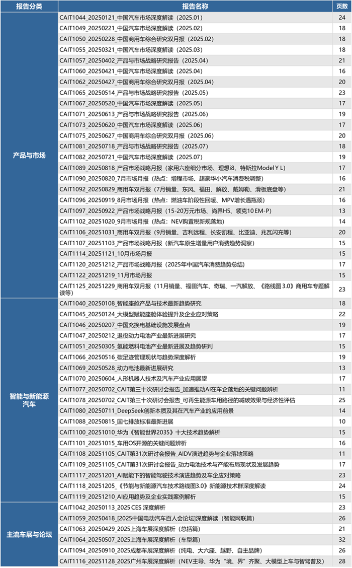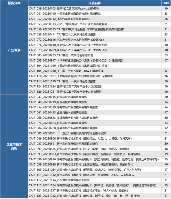 除了定制化咨询服务外,盖斯特管理咨询公司持续深耕产业与技术战略研究。2025年我们在产业发展、技术战略、产品市场、智能与新能源等领域,共计形成88期、1594页中英日文研究报告,并通过汽车产业与技术研究会(CAIT)平台,定向共享给国内外整车企业、供应商、科技企业以及部分行业组织等60余家会员单位,为会员单位的发展提供系统化前瞻研究支撑。以下我们选出受关注较高的五个重点研究成果进行简要介绍。