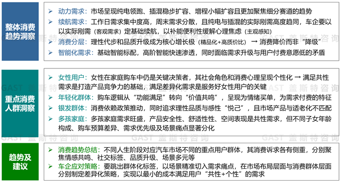 此报告从中国汽车市场的整体消费趋势、重点消费人群需求特征两大维度梳理,预测汽车市场核心走向,提出车企应对策略建议,为车企精准匹配消费需求趋势提供方向指引。盖斯特认为,当前中国汽车市场整体上在动力需求、续航需求、消费分层、智能化需求上呈现出多维特征,且消费者在不同人生阶段对汽车消费诉求各有侧重,既有共性特点又个性化凸显,涵盖情感共鸣、社交标签、品质升级、场景多元等多方面。本报告建议车企:需跳出群体标签化,着力以场景精准切入来解决需求痛点,同时在市场布局与目标群体层面分别制定差异化策略,用最小的成本满足用户“共性+个性”的需求。