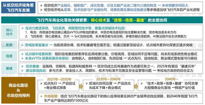 报告立足低空经济发展,系统梳理飞行汽车商业化落地的技术、政策、场景和基建四大关键要素,研究预判其商业化路径和市场空间。盖斯特提出,低空经济是耐心产业,需要各参与方放眼长远,同时脚踏实地推进。实现飞行汽车大规模商业化运营,既需要核心技术突破,也需要“政策—场景—基建”的全面生态化协同,以支撑产品性能提升、成本下降,逐步向大众用户普及,从而构建完整商业闭环,释放出产业价值。经研究测算,随着核心技术突破与生态完善,飞行汽车的核心应用场景及其对产业链带动效应逐步放大,预计到2040年中国飞行汽车产业产值将达1500亿元。此报告为企业布局低空经济提供从技术选型到市场规划的全方位洞察。