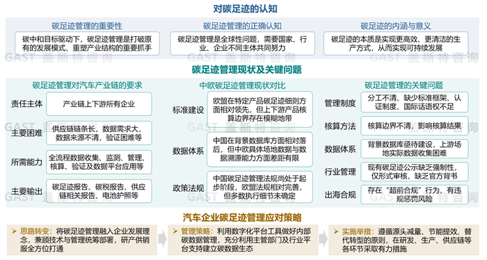 此报告重点围绕碳足迹管理现状、关键问题、车企应对策略展开研究。盖斯特认为,碳足迹管理是碳中和目标下重构产业结构的关键,需全球多主体协同,其本质是通过高效清洁生产实现可持续发展。当前汽车产业碳足迹管理面临数据体系、能力支撑、标准法规等难题,需产业链中全部企业打通数据连接,最终形成碳数据生态。对于汽车企业而言,应将碳足迹管理融入企业发展理念,兼顾技术与管理统筹部署。对内利用数字化平台工具,全方位打通研产供销服全链条,做好工厂、产品等碳数据管理;对外借助主管部门及行业机构支持,做好供应商碳足迹数据管理。