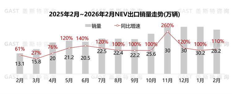 2月,新能源汽车出口28.2万辆,环比下降6.6%,同比增长1.1倍。从车型结构看,NEV乘用车出口贡献超15万增量;从动力类型看,纯电车型贡献超9万增量。